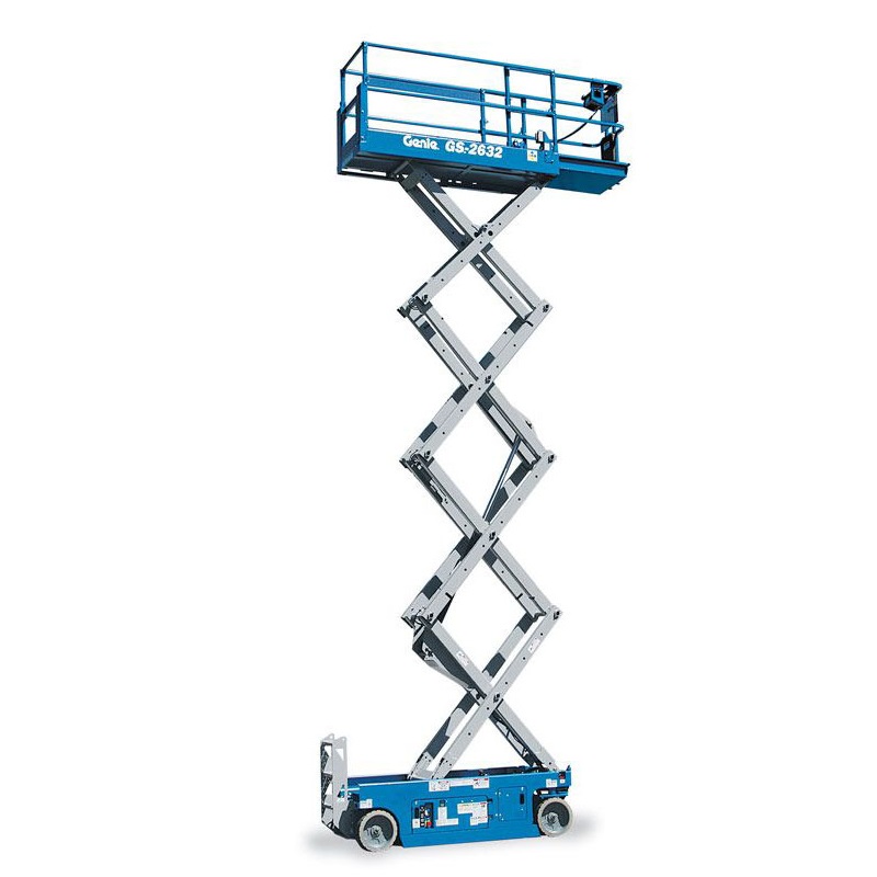 Genie-GS 2632此款車輛為窄板8M高空車,車寬約81cm,可進入90cm室內隔間門內工作,其剪叉垂直升降設計適用於平整RC或柏油地面之木作裝潢工程、排風(煙)管、空調、消防、水電、監視系統、網路線路、 廠房倉庫搭建、外牆塗裝維修與看板修補等。